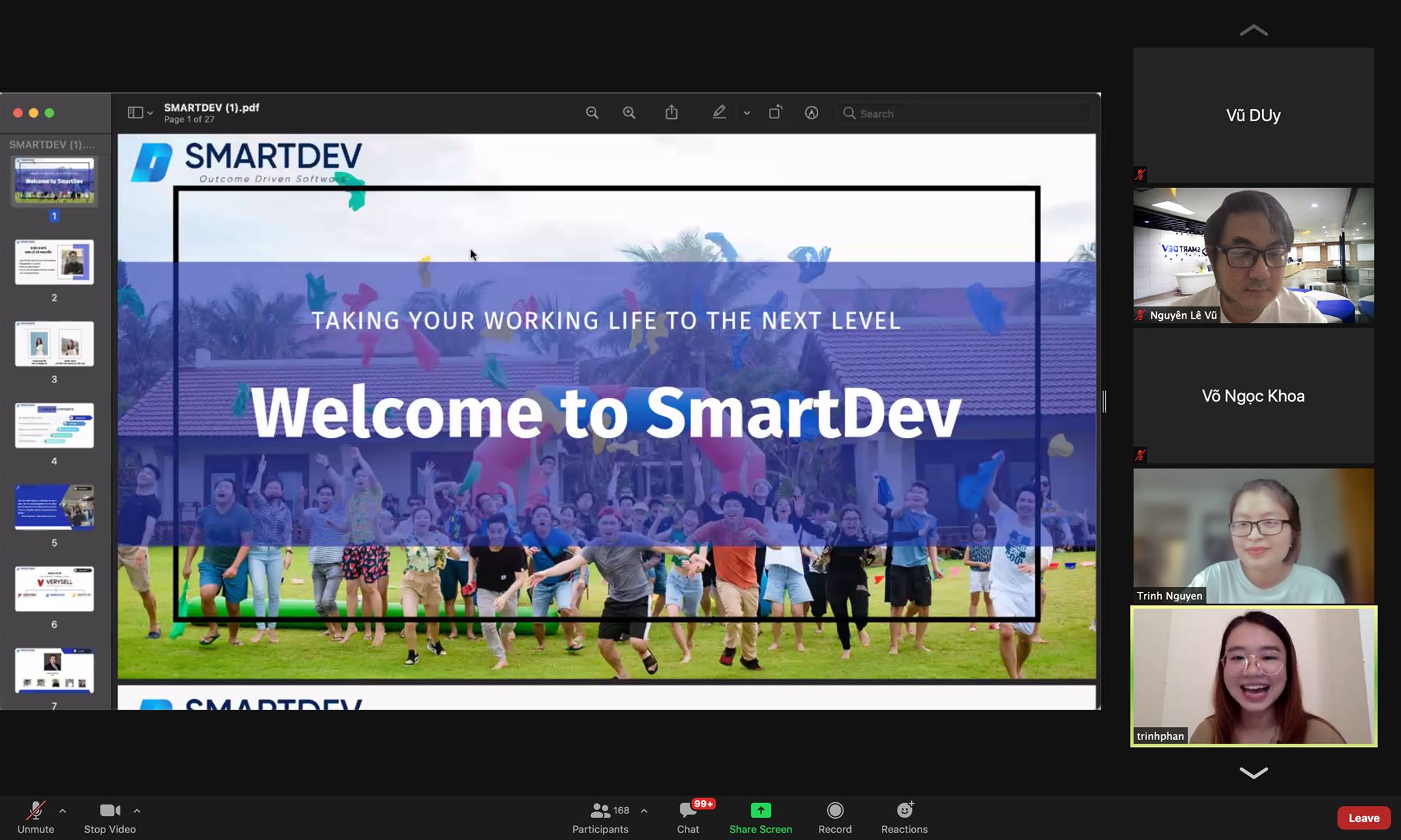 Chúng ta thực sự đang ở trong một kỷ nguyên mới, và theo nhiều khía cạnh, nó có vẻ tươi sáng – đặc biệt là trong lĩnh vực công nghệ ở Việt Nam. Hội thảo không chỉ cung cấp thông tin kiến thức, mà còn là buổi trao đổi sôi nổi khi mỗi người đều có một phần câu hỏi và trả lời hấp dẫn, đi kèm các trò chơi thú vị. Kết thúc chuỗi hội thảo, SmartDev nhận được rất nhiều đánh giá tích cực từ sinh viên cũng như ban lãnh đạo tại các trường Đại Học; đây là nguồn động lực rất lớn để SmartDev có nhiều hoạt động giáo dục bổ ích trong tương lai.