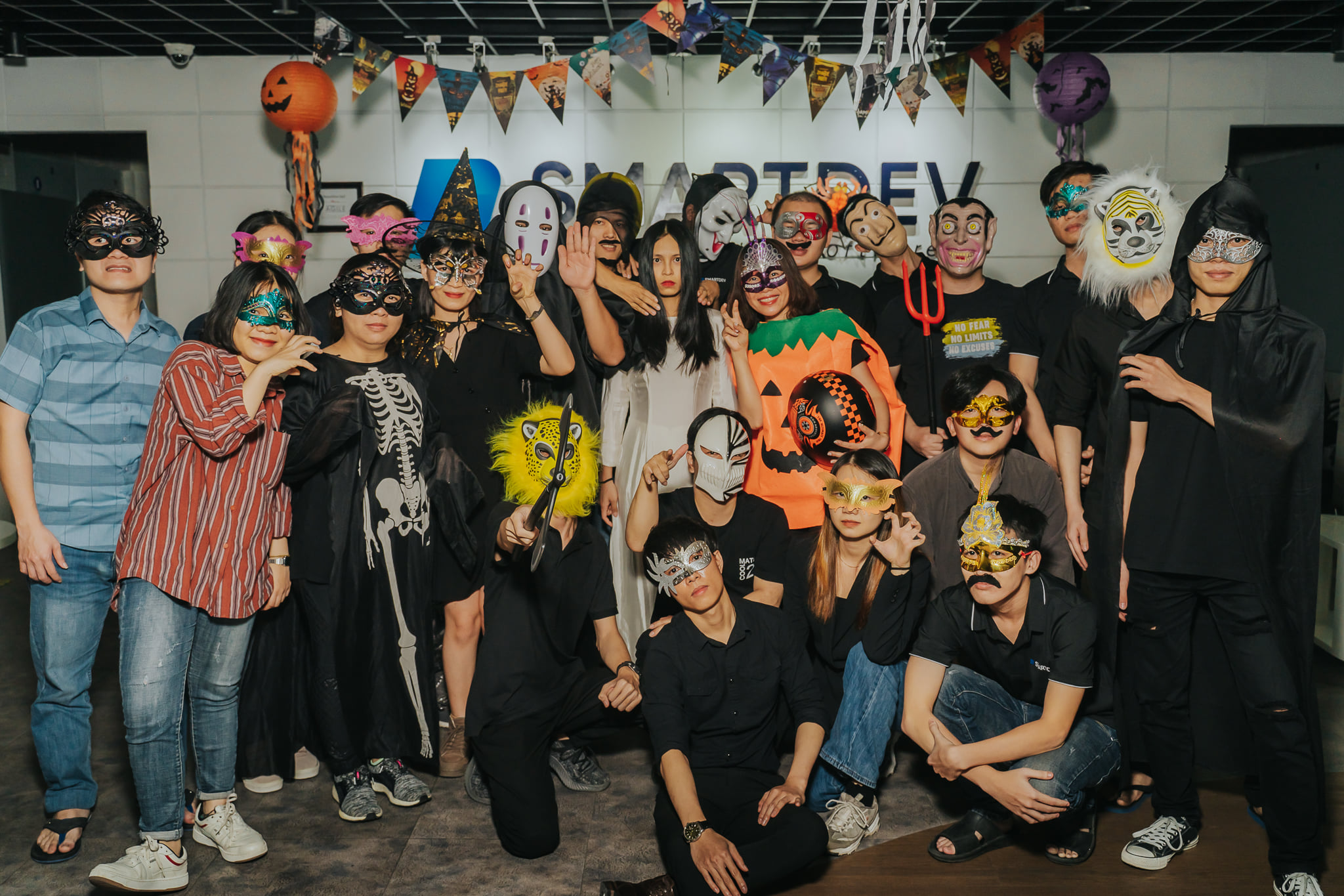 Bên cạnh trang trí văn phòng theo phong cách âm u đầy ma mị, hóa trang thành những nhân vật rùng rợn quỷ quái, chúng mình đã cùng nhau quẩy hết mình với tiệc rượu và chơi các trò chơi vô cùng hài hước và sôi nổi. Hãy cùng xem qua những hình ảnh thú vị trong đêm Halloween tại Văn phòng SmartDev nhé!